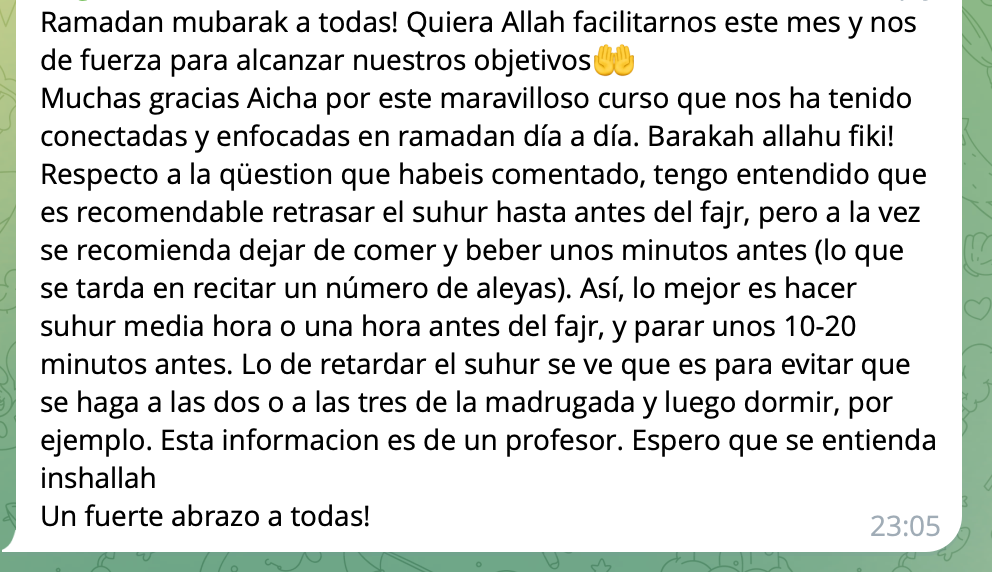 Grupo privado de Telegram con soporte diario durante 2 meses (todo el mes de Shaban y de Ramadán)